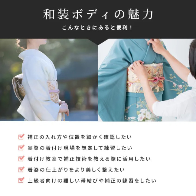 美しい着姿をつくるために必要な「補正力」をしっかり身につけられる、上級者や指導者を目指す方におすすめの一体です。