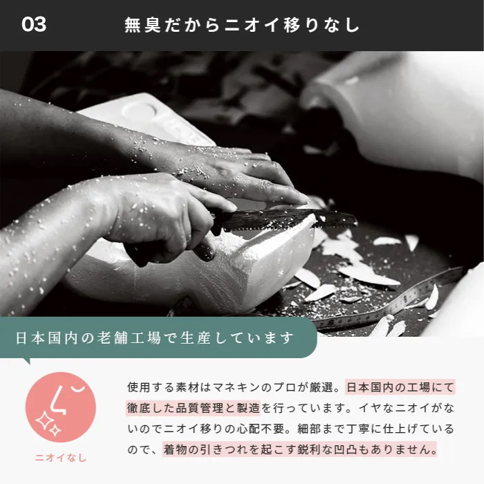 使用する材料はマネキンのプロが厳選。日本国内の工場で徹底した品質管理・製造を行っています。