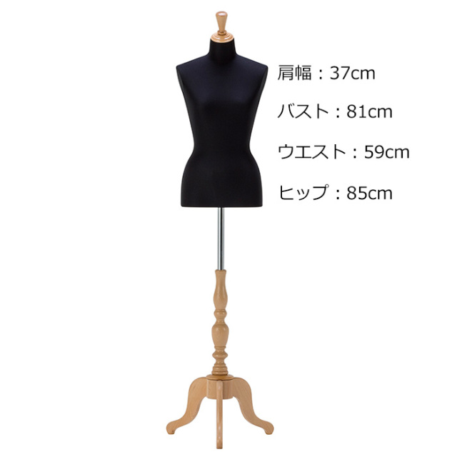 | スペック | ~素材~ ボディ:発泡スチロール製 黒スムースニット張 ヘッド:木製 クリア仕上 アーム:なし ベース:木製三脚 クリア仕上 パイプ:スチール製 メッキ仕上 ~サイズ~ 9号:肩幅37・バスト81・ウエスト59・ヒップ85cm (肩幅は腕ありの場合、腕部分は含まないものとする) ベース:41×41cm パイプ:φ2.5cm 本体高さ(ヘッドを含む):73cm ボディ丈:63cm 全体高さ:最大182・最小143cm |