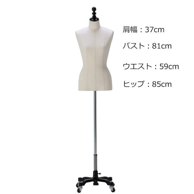 | スペック | ~素材~ ボディ:発泡スチロール製 キャンバス張 ヘッド:木製 黒半艶塗装 アーム:なし ベース:鉄鋳物製 黒半艶塗装 パイプ:スチール製 メッキ仕上 ~サイズ~ 9号:肩幅37・バスト81・ウエスト59・ヒップ85cm (肩幅は腕ありの場合、腕部分は含まないものとする) ベース:31×31cm パイプ:φ2.5cm 本体高さ(ヘッドを含む):73cm ボディ丈:63cm 全体高さ:最大179・最小143cm |