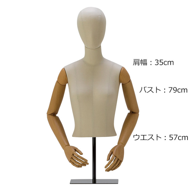 | スペック | ~素材~ ボディ・ヘッド:発泡スチロール製 綿麻グレージュ張 アーム:木目調樹脂製 ※関節可動可能・取り外し可能 ベース:スチール製 黒塗装 ~サイズ~ 7号:肩幅35・バスト79・ウエスト57cm ベース:25×23cm パイプ:φ1.9cm 本体高さ(ヘッドを含む)::67cm ボディ丈:50cm 全体高さ:最大97・最小79cm ※お客様組み立て式 |