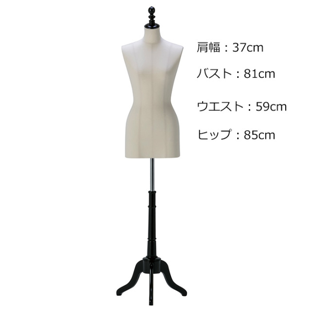 | スペック | ~素材~ ボディ:発泡スチロール製 キャンバス張 ヘッド:木製 黒半艶塗装 アーム:なし ベース:木製三脚 黒半艶塗装 パイプ:スチール製 メッキ仕上 ~サイズ~ 9号:肩幅37・バスト81・ウエスト59・ヒップ85cm (肩幅は腕ありの場合、腕部分は含まないものとする) ベース:41×41cm パイプ:φ2.5cm 本体高さ(ヘッドを含む):83cm ボディ丈:77cm 全体高さ:最大180・最小141cm |