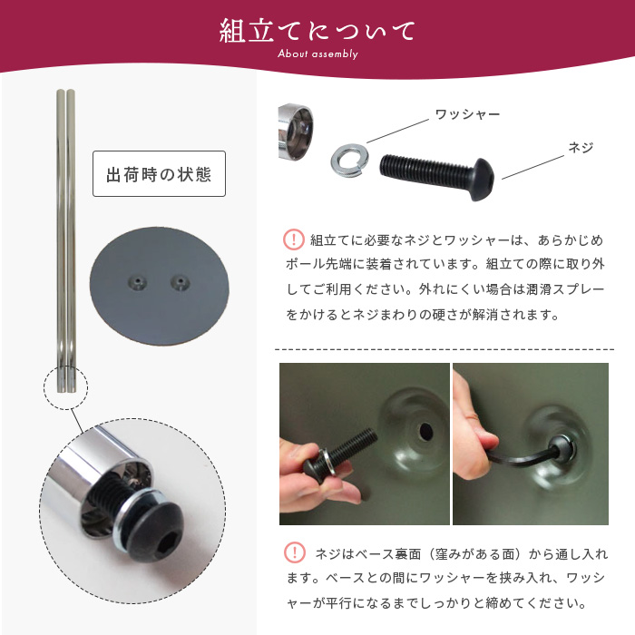 ※ポールからネジが外れない場合、潤滑スプレーをかけていただくことでネジまわりの硬さが解消されます。 |