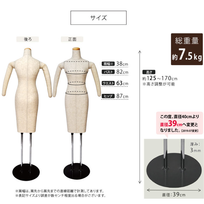 B82 W63 H87 肩幅38 ボディ丈105 高さ140~170 |